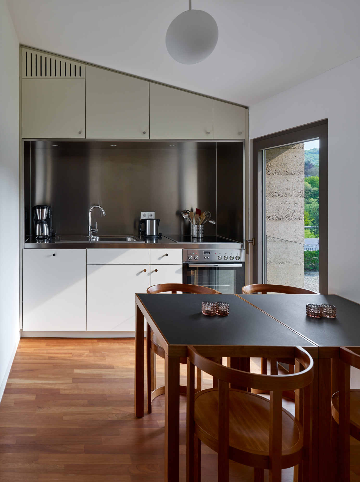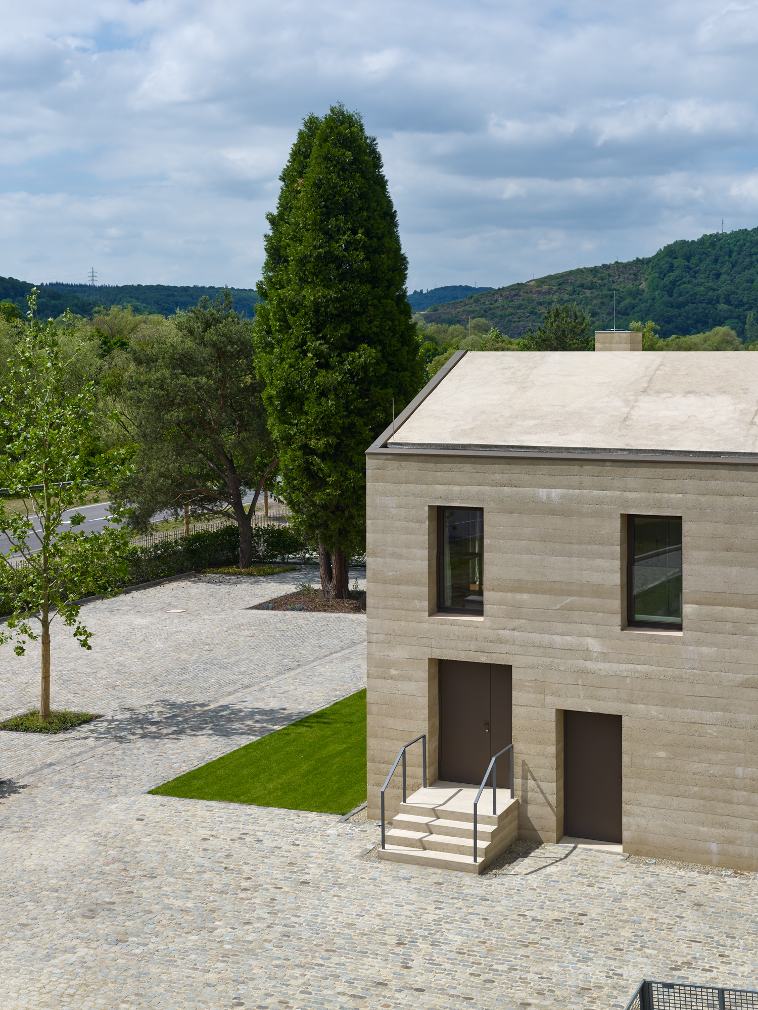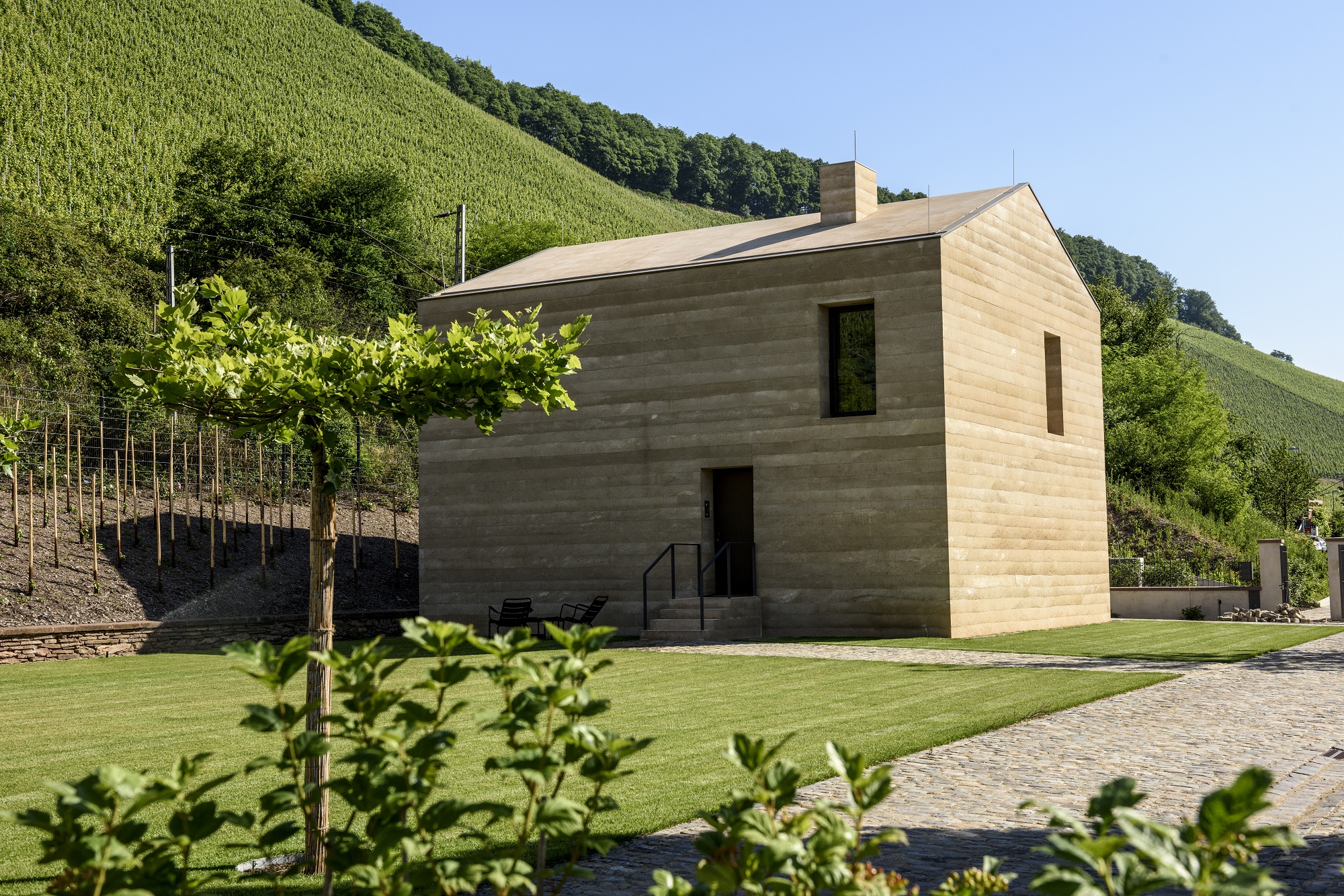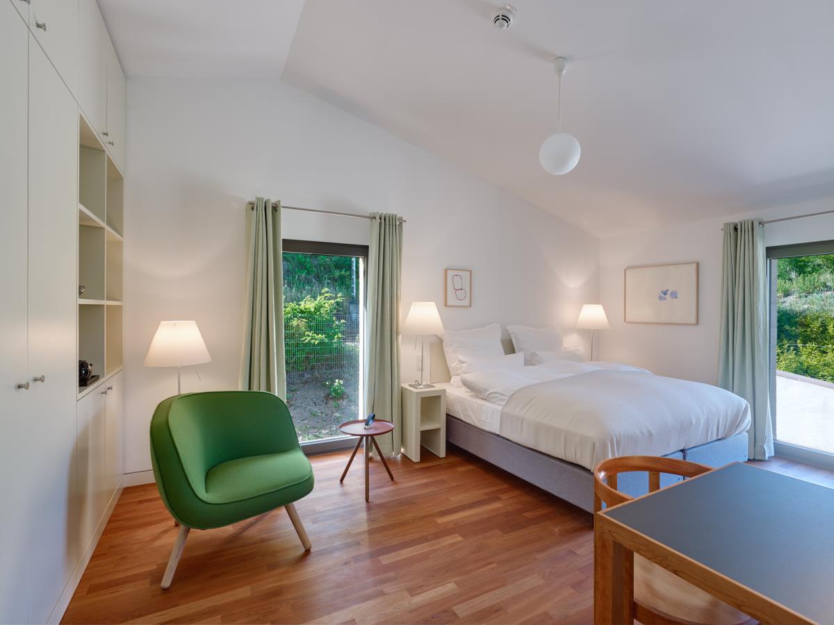 Das Zimmer Klosterberg in der von Max Dudler gestalteten Remise bezieht seinen Namen auf die Weinlage Wiltinger Klosterberg. Aus dem östlichen Fenster schweifen die Blicke über die Weinberge des berühmten Saarweinortes Wiltingen. Das Zimmer bietet eine klare Architektur und durchdachte Möblierung – ebenfalls entworfen von Max Dudler. Die Spitzform des Daches läßt sich von innen nachvollziehen. Das Terrazzotreppenhaus der Remise sowie die Kirschholzböden und -möbel schlagen die Brücke zum Gutshaus, welches innenarchitektonisch mit denselben Materialien gestaltet ist.