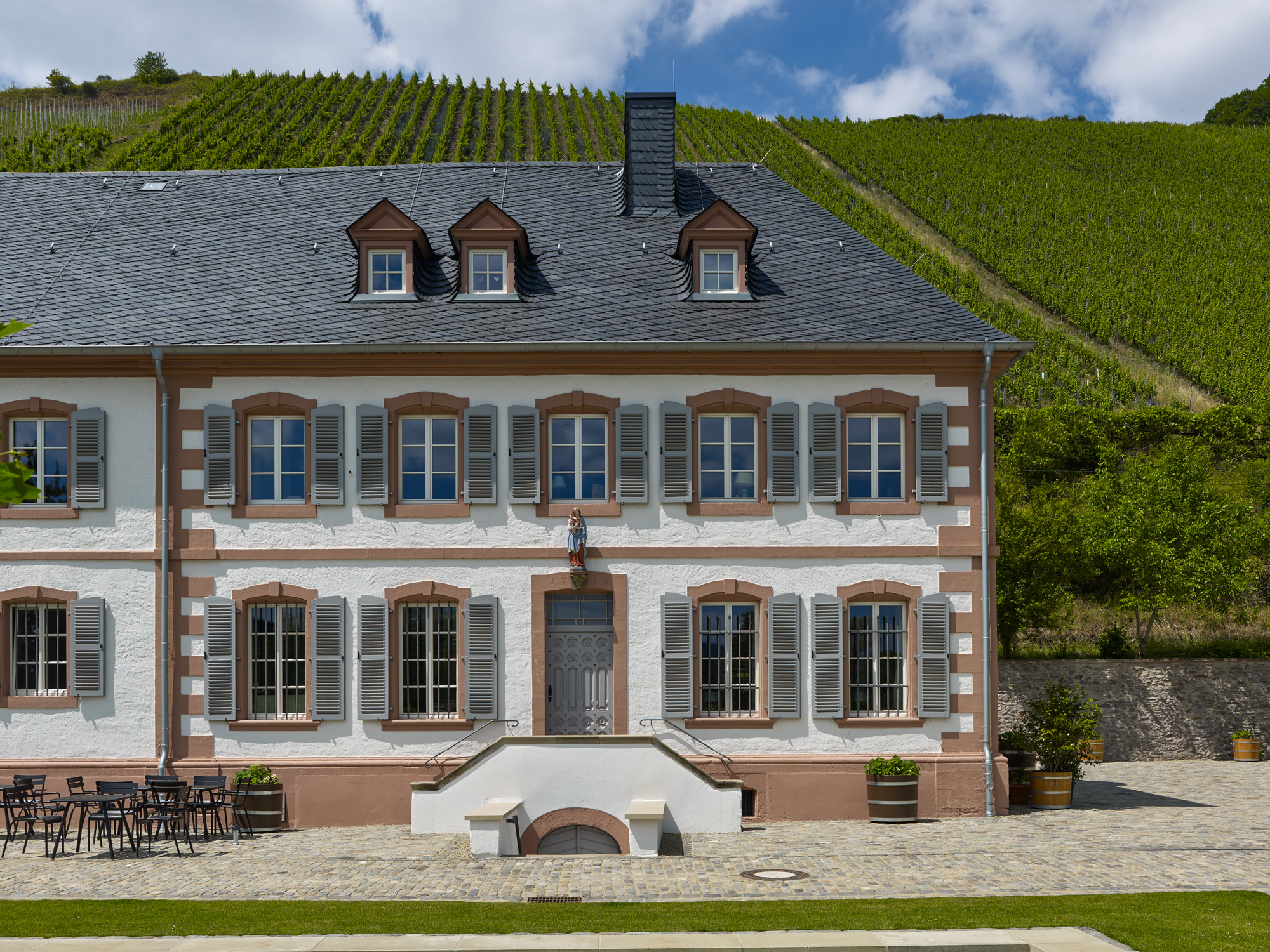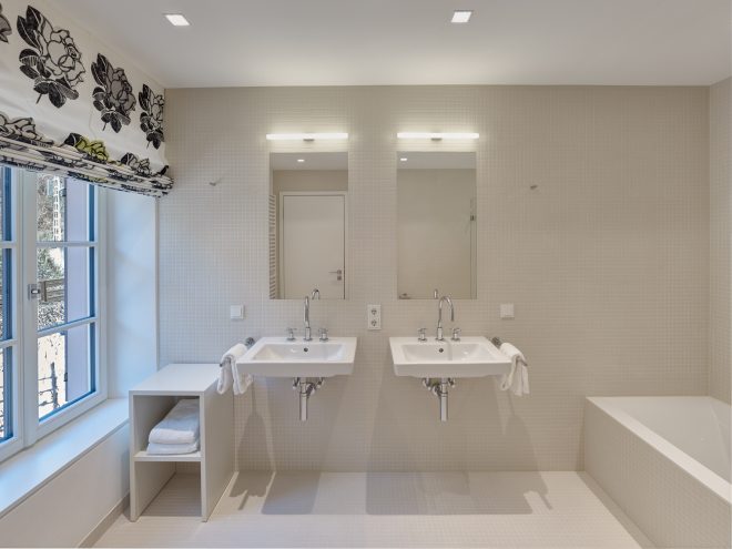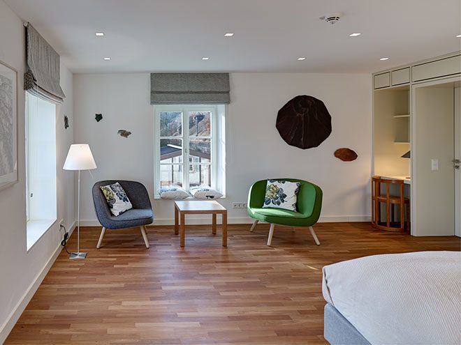Die Suite Altenberg ist der Ort im Gutshaus, um Raum und Zeit zu vergessen – wie bei einem Glas eines herausragenden Weins aus der weltberühmten Lage Kanzemer Altenberg. Der Schlaf- und Wohnraum dieser geräumigen Suite genießt Lichtfluten aus dem Westen und dem Süden. Am Nachmittag laden die komfortablen Fensterbänke und Sessel zum Blick auf die glitzernde Saar ein. Eine großzügige Ankleide und ein luxuriöses Badezimmer mit Dusche und Badewanne tragen zur Erholung auf Gut Cantzheim bei.